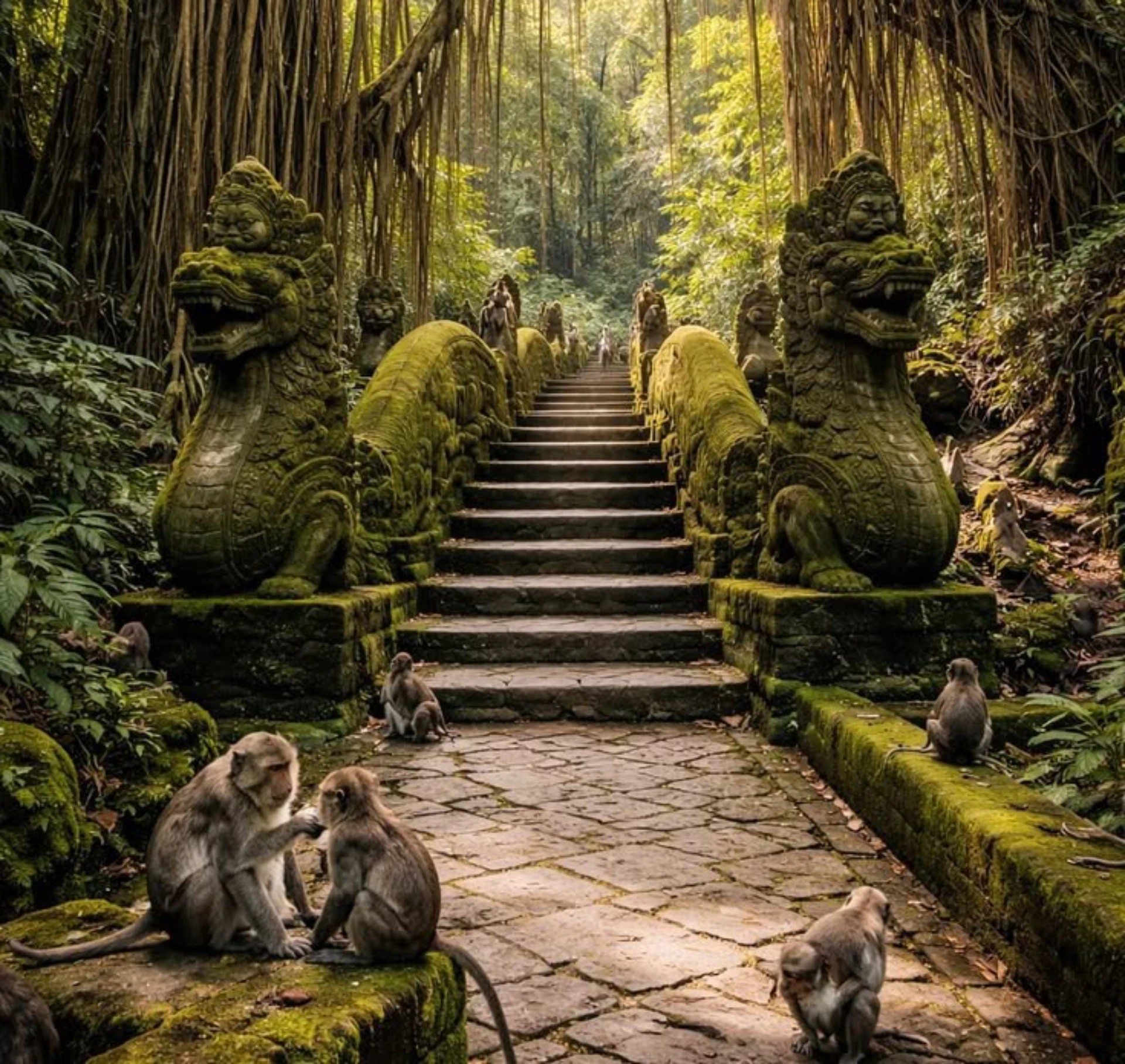 Interact with playful monkeys at the Ubud Monkey Forest sanctuary
